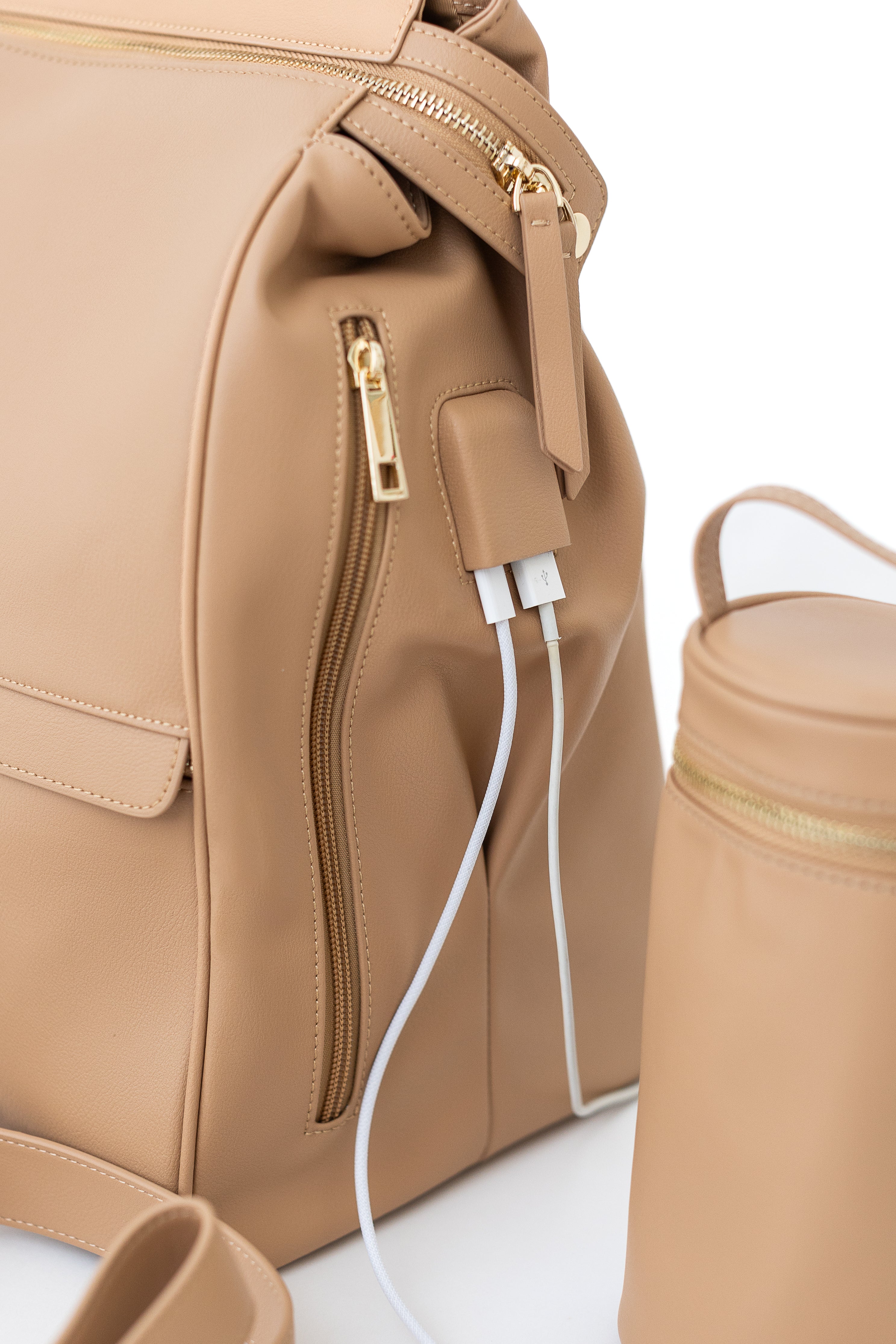 Includes changing pad, stroller straps(2), shoulder strap, bottle holder, USB charging port